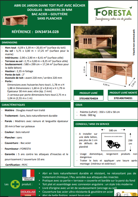 Installation : Sur dalle béton ≤ 1 cm de défaut, usage domestique, lasure recommandée après montage