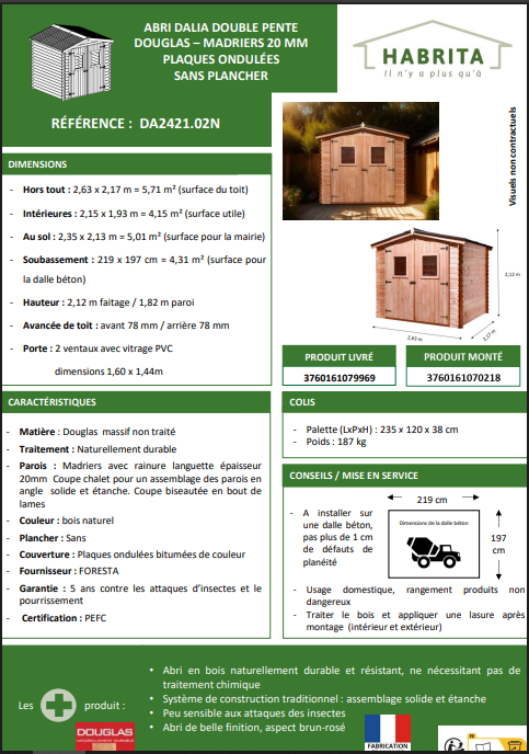 Abri de jardin bois Douglas DA2421 – Double pente 4,15 m²