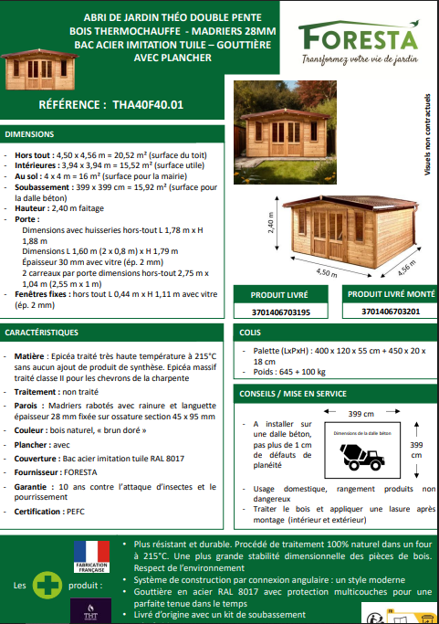 🏡 Abri de jardin bois thermochauffé double pente – Modèle THA40F40.01