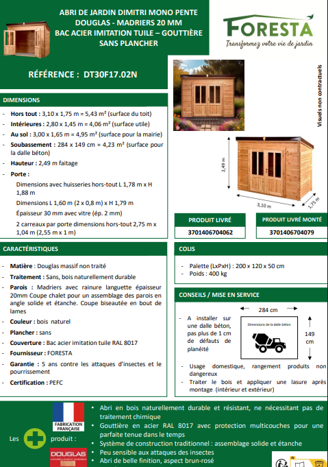 Optez pour l’abri DT30F17.02 mono‑pente, une construction en Douglas naturel 20 mm 🌲, issu de forêts gérées durablement (certifié PEFC). Sa teinte brun‑rosé chaleureuse sublime votre jardin, tout en offrant une résistance naturelle aux insectes, sans aucun traitement chimique 🐜❌.