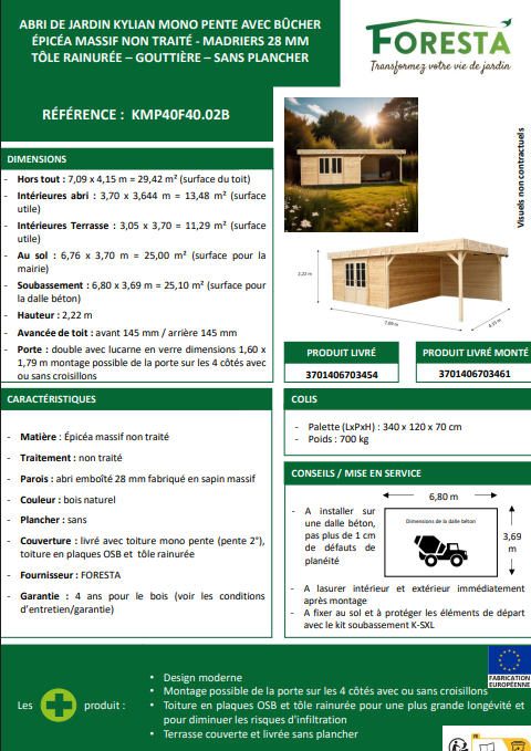 📦 Livré sans plancher, à installer sur une dalle béton parfaitement plane (défaut max. 1 cm). Pensez à lasurer le bois intérieur et extérieur juste après le montage pour garantir sa longévité 🛡️.