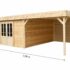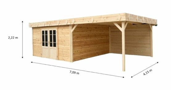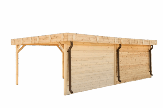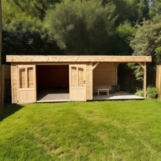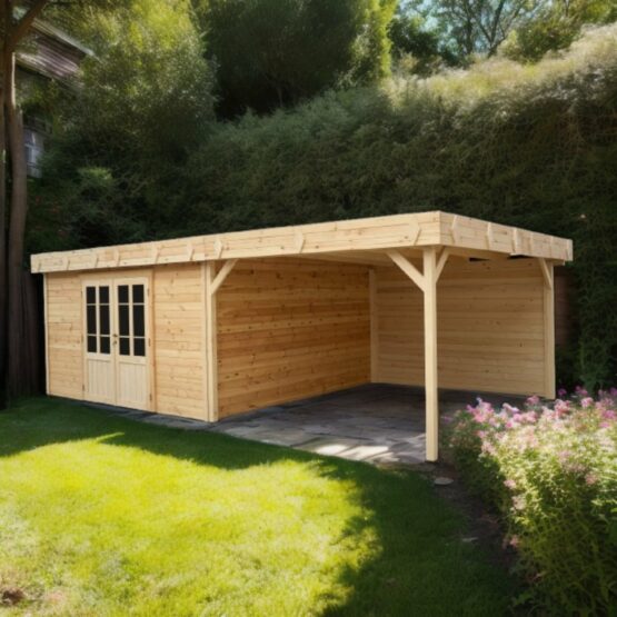 Avec son toit mono pente moderne et son bûcher latéral couvert, il associe parfaitement design et fonctionnalité. Fabriqué en épicéa massif non traité 🌲 (madriers de 28 mm), il séduit par son aspect naturel et sa solidité.