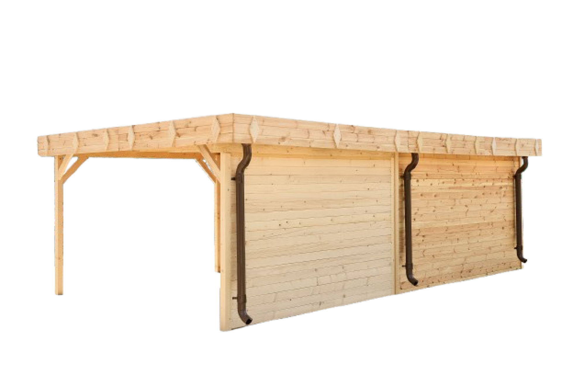 La toiture en plaques OSB + tôle rainurée garantit une excellente protection face aux intempéries ☔. Et grâce à la gouttière intégrée, l’évacuation de l’eau de pluie se fait en toute simplicité.