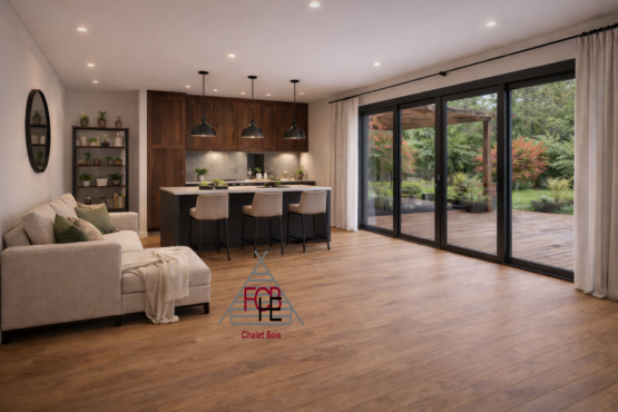 Ce chalet bois de 103 m² dispose d’une surface habitable de 90 m² et comprend 3 chambres, offrant une organisation intérieure optimale pour une famille.