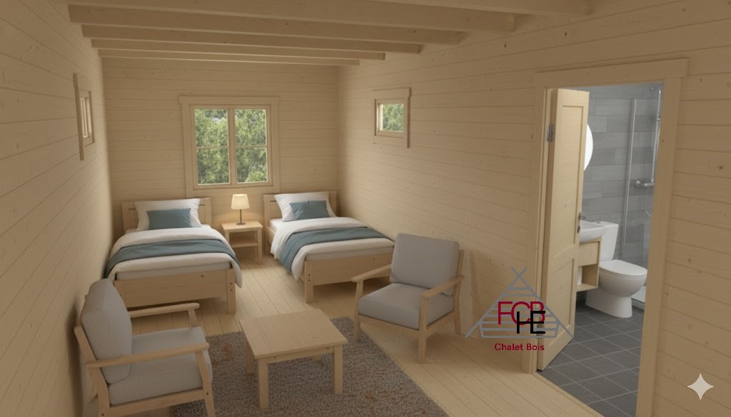 🏡 Chalet bois sur 2 niveaux – 68 mm | 20 m² + 20 m² étage | Couverture bitumée incluse