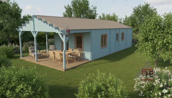 Le chalet bois 68 mm avec bardage N°091225 est un modèle spacieux et moderne conçu pour un usage confortable toute l’année.