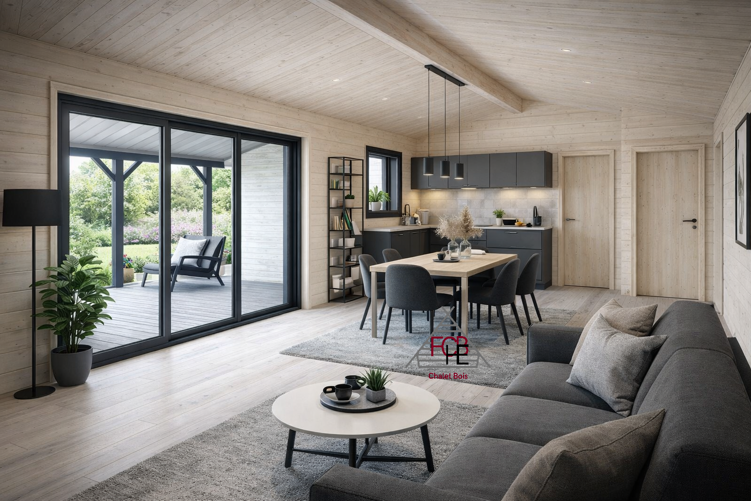 Chalet N°09125 /68mm + 100+ Bardage –111 m² avec terrasse de 46m² / Habitable 65m² avec 2 chambres