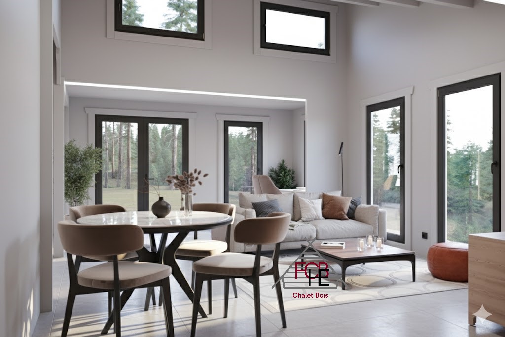 Le chalet Bora 44 est équipé de 10 menuiseries Premium (double vitrage 4/20/4 mm) assurant une excellente luminosité naturelle et une isolation de base performante.