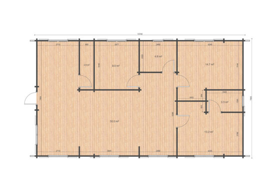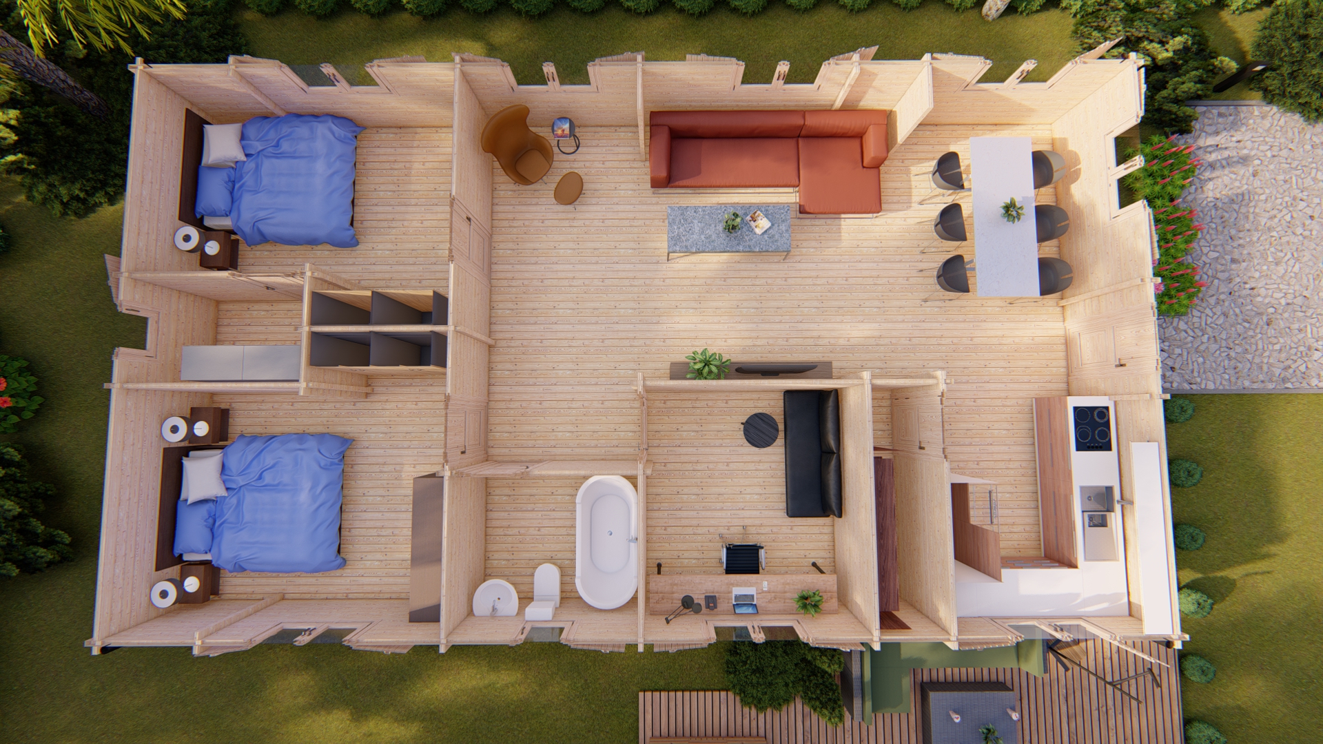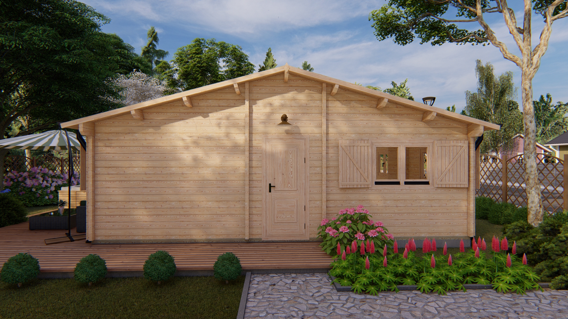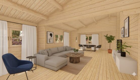 Avec ses 97,8 m² de surface intérieure répartis en 2 grandes pièces, le chalet bois Sévilla en madriers 68 mm représente une solution haut de gamme pour tous vos projets d’aménagement : habitation, gîte, bureau ou atelier.