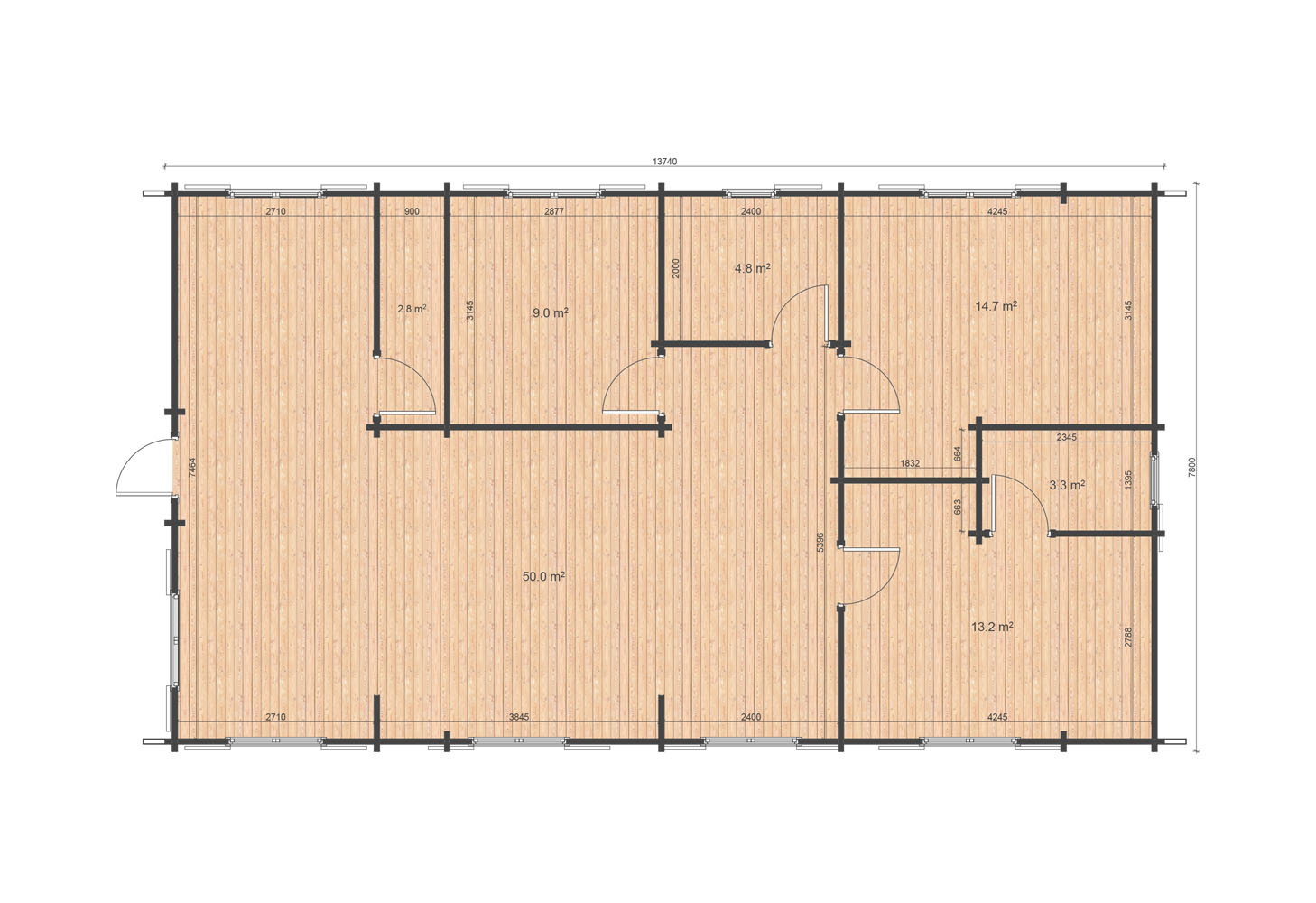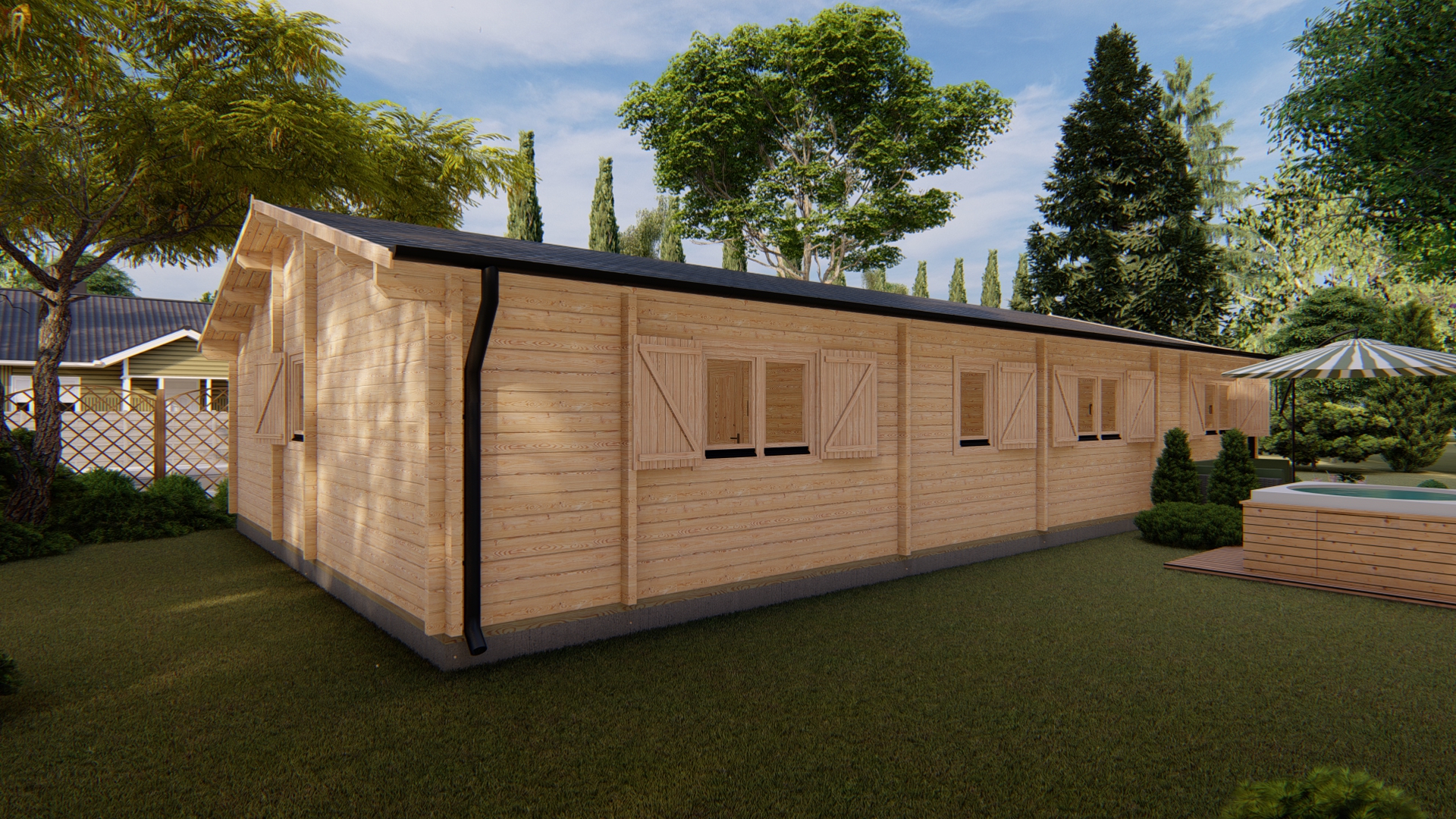 Son format généreux (7,8 × 13,74 m), sa hauteur de faîtage de 3,3 m et ses madriers épais de 68 mm en font un modèle à la fois esthétique, confortable et parfaitement isolable si besoin.
