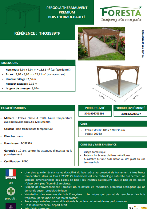 ♻️ Un choix responsable : issue de forêts françaises gérées durablement (certification PEFC), la THO3939TF remplace avantageusement les bois exotiques tout en soutenant les circuits courts. Chaque pergola est une promesse d’authenticité et de respect de l’environnement 🌱.