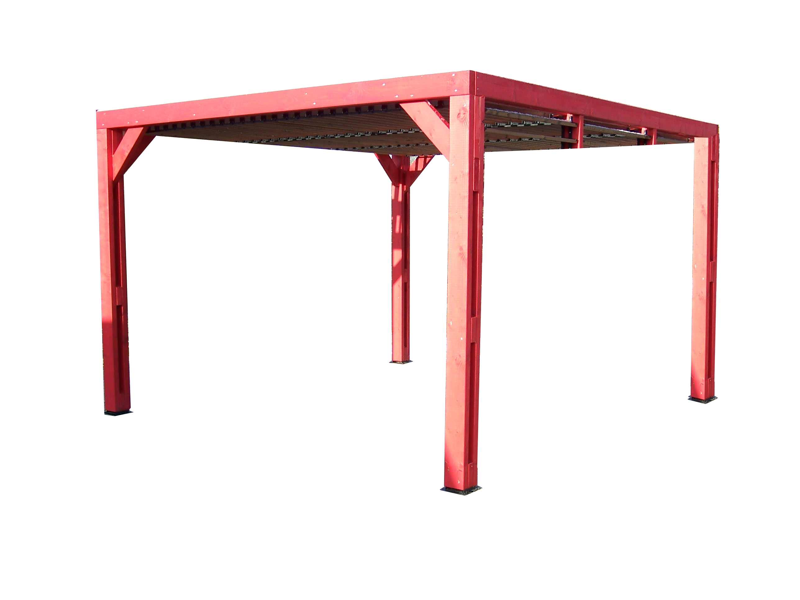Pergola en épicéa traité haute température, avec poteaux de 12 x 12 cm (2 pièces moisées de 12 x 4 cm assemblées avec des tirefonds de 7 cm)